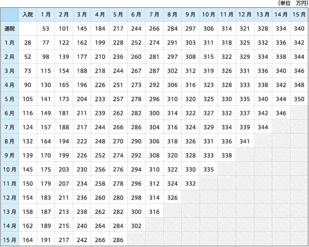 入院後に通院があった場合・・・該当する月数が交差するところの額通院慰謝料は、隔日通院の原則を示す。したがって、通院実日数が隔日通院より多い場合または少ない場合には、適宜増減して認定する。